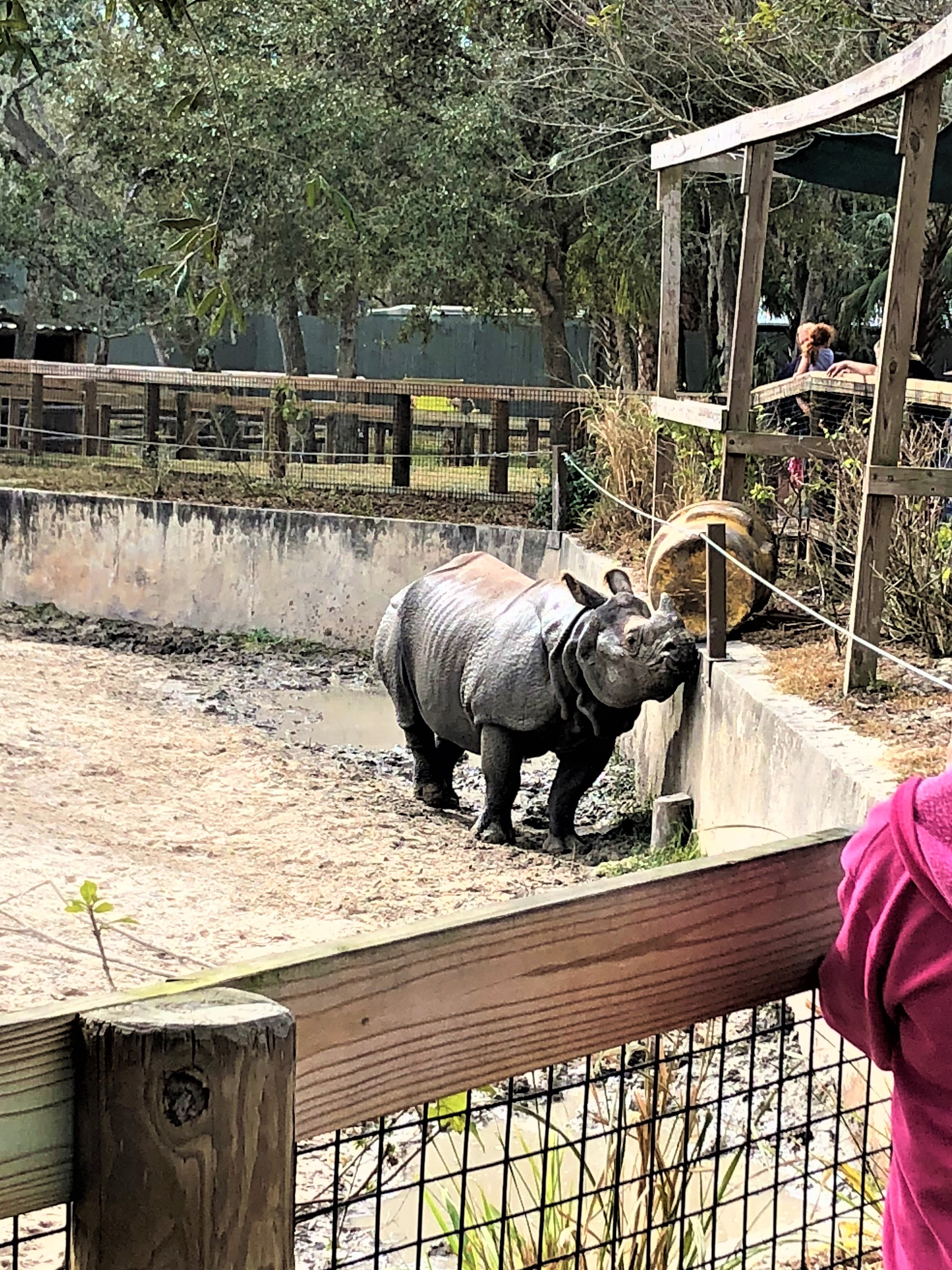 There’s a huge area for the rhinos to roam and swim. A little farther down the path you’ll find the giraffe exhibit. You can normally feed the giraffes and we had planned to do that with my niece, but the keepers said they were not cooperating that day. There were three giraffes, one was in the back corner keeping a close eye on his keepers who were cleaning and maintaining his house. One was snoozing in another corner and the third was feeding himself on a palm tree. They were still beautiful to look at.