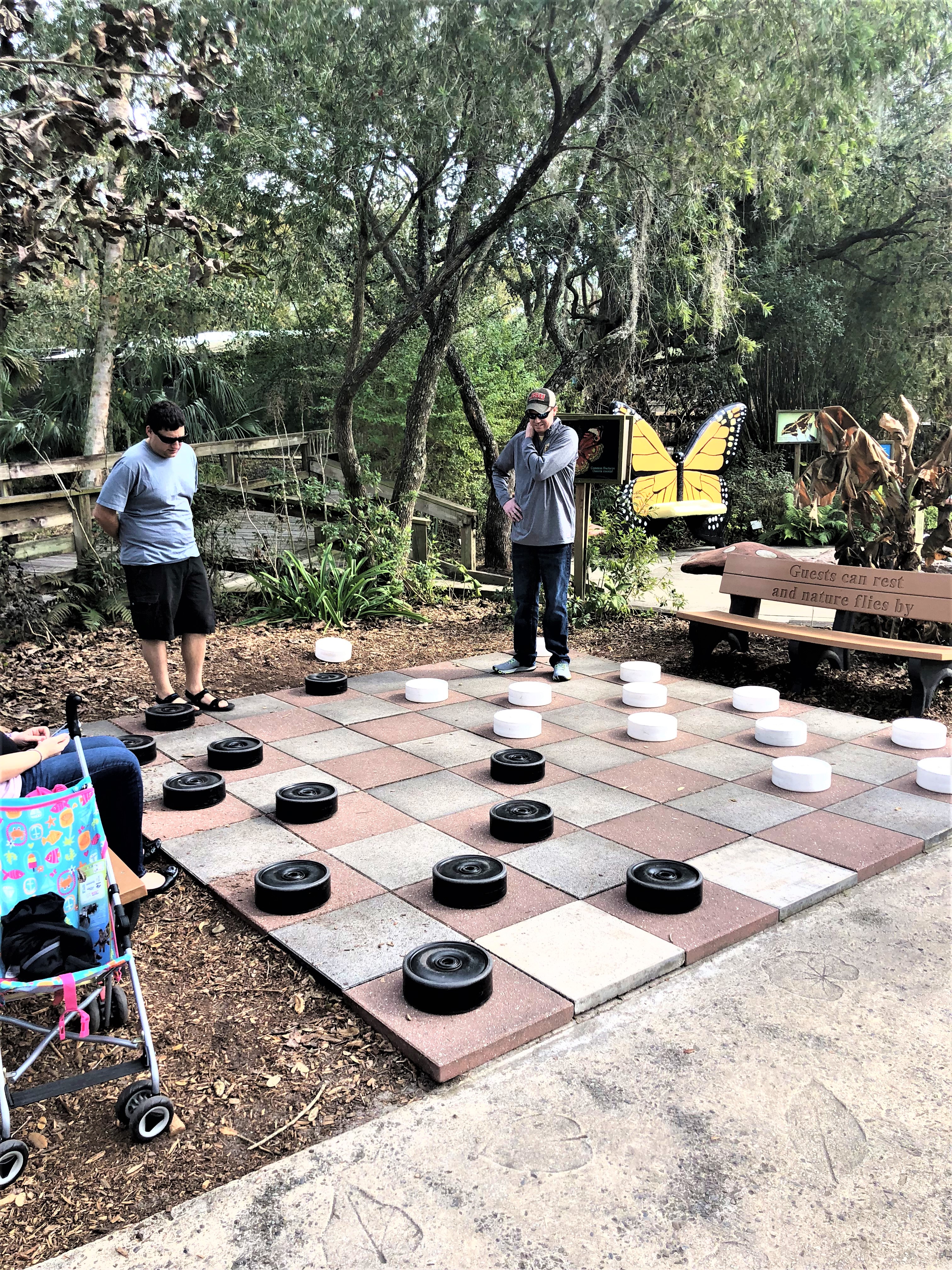 Right in the middle of the zoo is an activity area with a playground for the kids, a butterfly bench for pictures and life size checkers board. We took a little break for the guys to play a game of checkers, but with my niece interested in all the checker pieces it proved challenging.